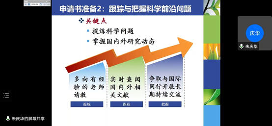 朱教授主要针对国家自然科学基金申报中的青年基金和面上项目,从基金申请书的准备、准备过程中要问自己的几个问题以及后评估和研究成长的几点思考等方面向与会教师讲授了自己的经验。朱教授强调申请书的准备一定要能够针对国情、与国际接轨,并需要跟踪与把握科学前沿问题,可以向有经验的老师请教、实时查阅国内外文献以及争取与国际同行开展持续交流而实现。继而朱教授详细讲解了申请书中每一个内容模块的填写规范及注意事项。