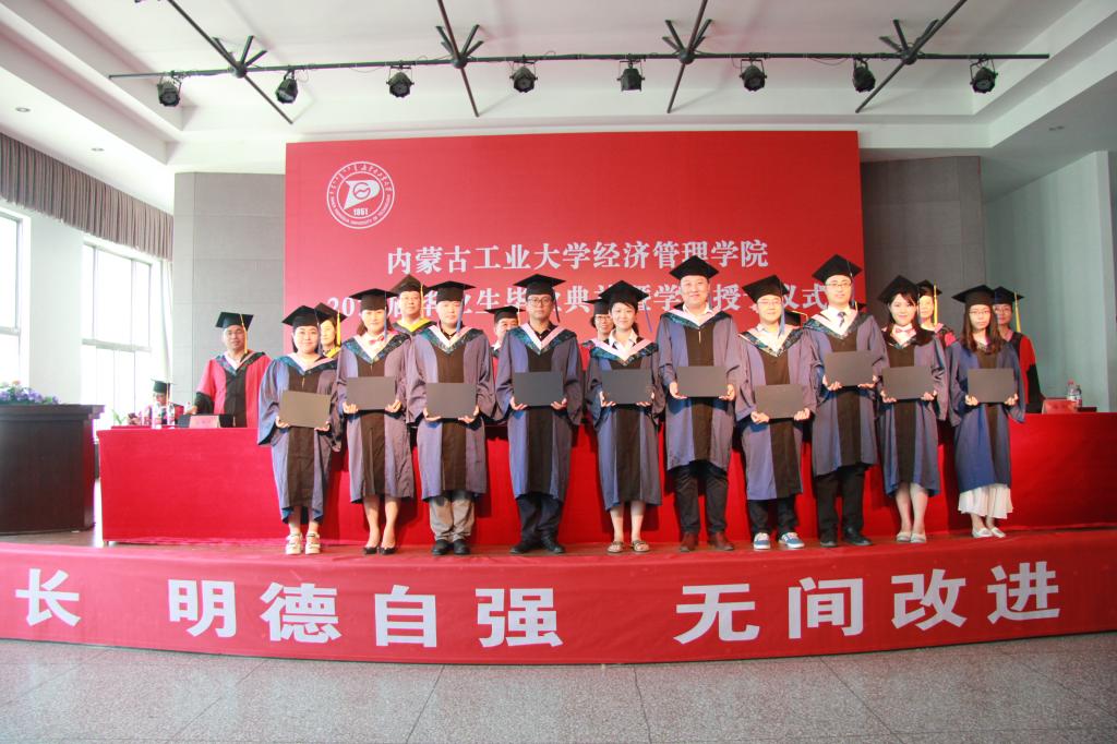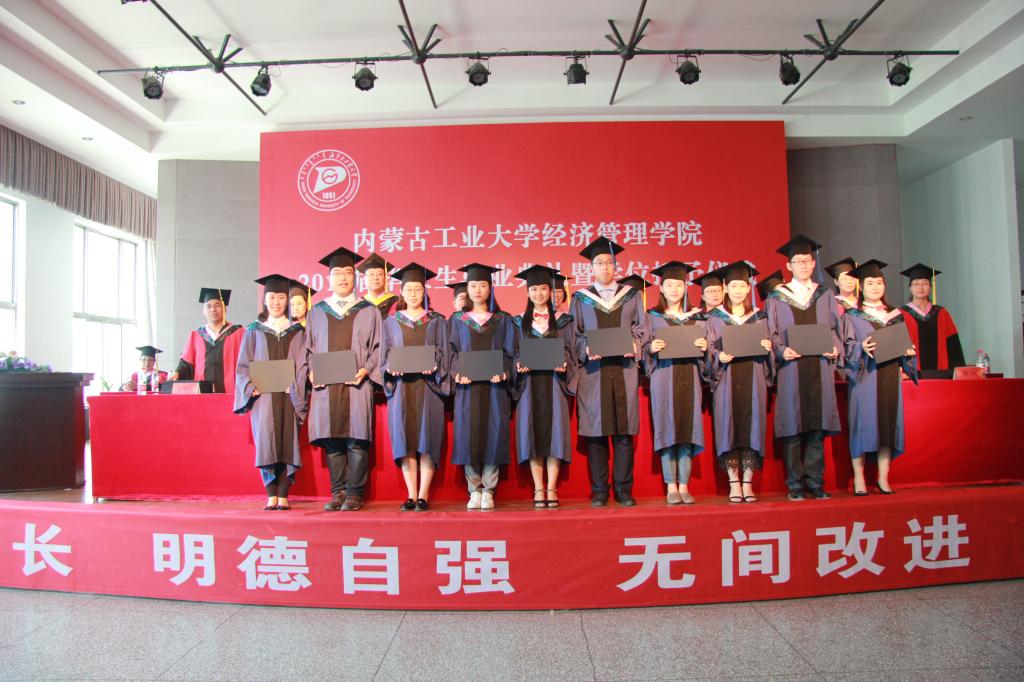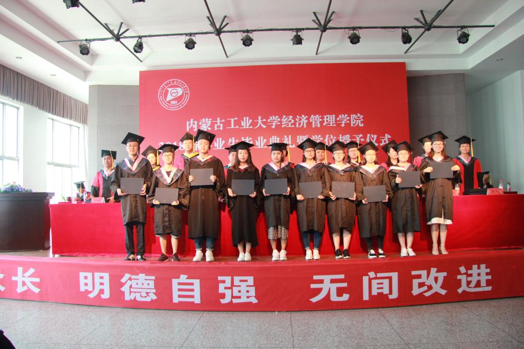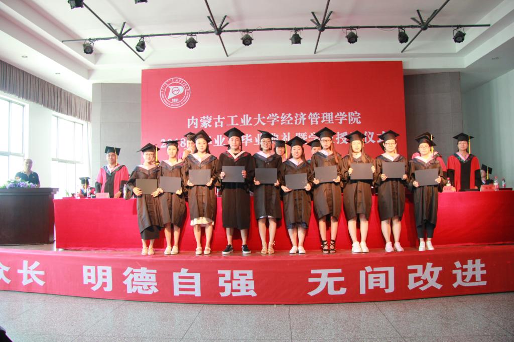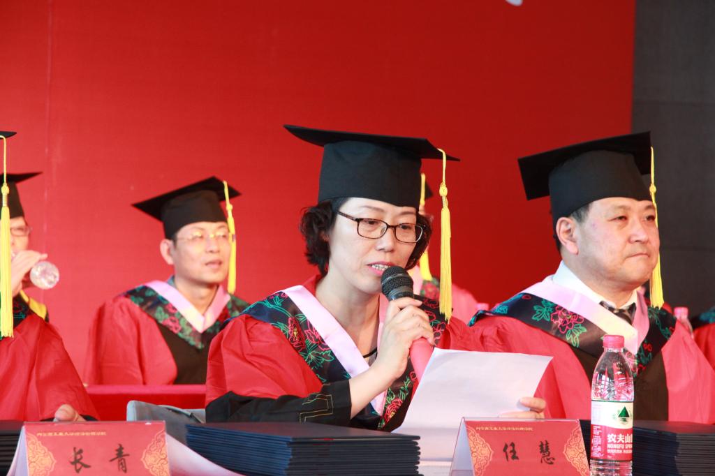 主席台领导、老师为获得校级“三好”员工、优秀员工干部、优秀毕业生代表颁发获奖证书;为获得硕士学位、学士学位的毕业生颁发学位证书,拨穗正冠,握手合影。