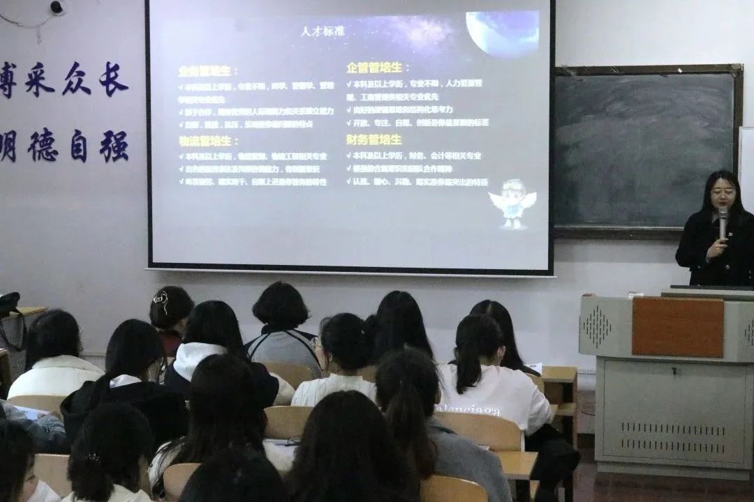 招聘会上,连苏敏播放了公司的简介短片,向同学们介绍了招聘的相关岗位和具体工作内容,让同学们对于所需岗位和工作环境有了初步的了解。随后,连苏敏重点讲述了以互联网为依托的医药发展新形势,并表示九州通能够为毕业生提供职场培训,丰富相关知识,提升职业能力。同时,连苏敏详细介绍了招聘要求并就同学们提出的各类问题进行耐心细致的回答。