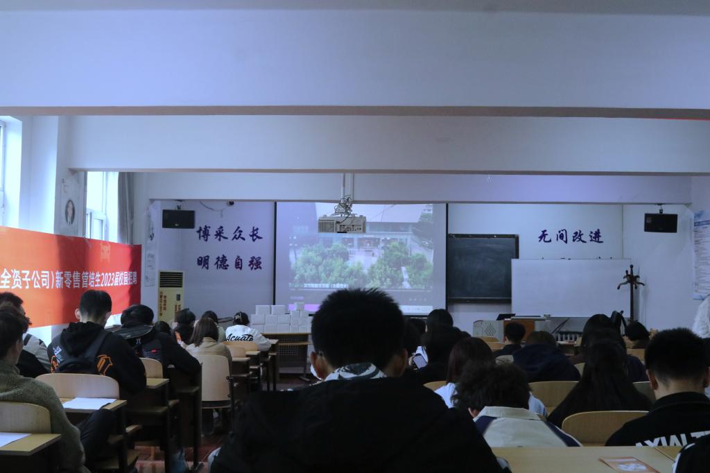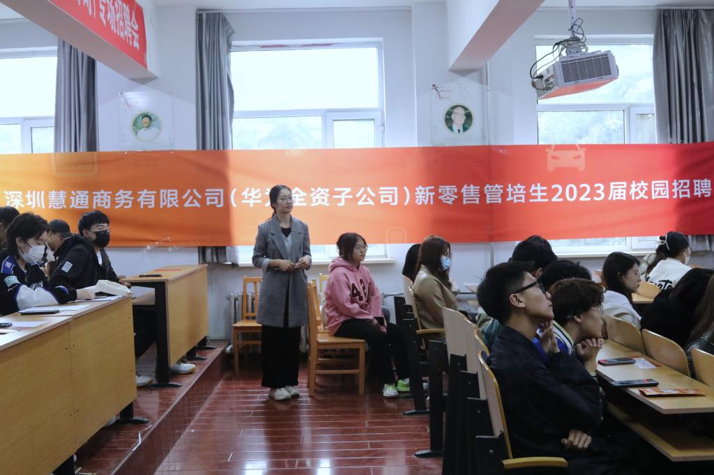 4月21日,365英国上市网站官网于主楼210教室举办深圳慧通商务有限公司新零售管培生2023届校园招聘会。深圳慧通商务有限公司业务部副部长张亚、人力资源部总监刘俊邑、苏然主讲,公司部分毕业生参会。