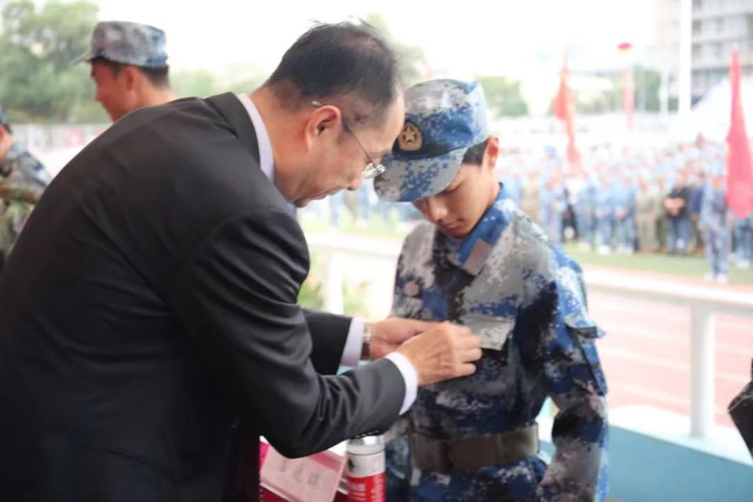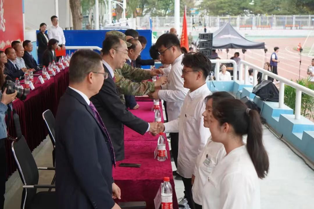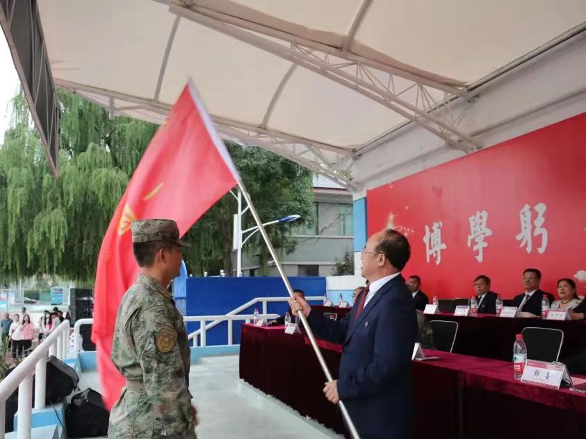 公司党委书记李占峰为军训各团长授军训旗,宣布英国365网站2023级员工军事技能训练开始。