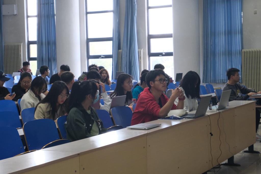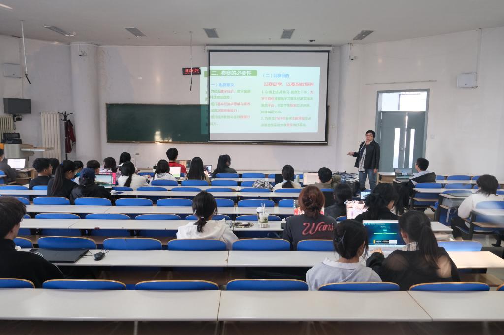 在培训会上,红光老师详细介绍了比赛的规则、流程,结合竞赛平台操作讲解宏微观经济学基本规律和知识,生动有趣又有实操感的互动案例带给同学们不同于课堂理论学习的新鲜体验,让同学们了解比赛的同时体会到经济学理论是如何应用在实际生产生活中的。贾宁和粟丹妮同学作为参赛选手,通过分享她们的参赛经验和心得为同学们提供了很多实用技巧和建议。同学们在培训会上认真听讲,积极参与讨论,围绕自己在模拟比赛中遇到的困难与人交流,分析交换解决方法的同时也为其他同学提供了很好的借鉴。