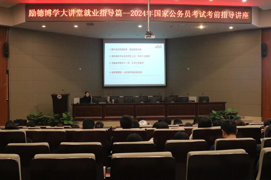 为帮助同学们全面了解公务员考试的考情政策、报考及备考方法、掌握考公要领,11月22日,365英国上市网站官网于图书馆报告厅举办“2024年国家公务员考试”考前指导讲座,中公教育仁佳老师主讲。