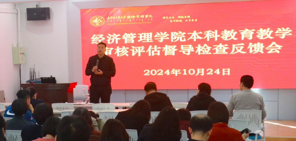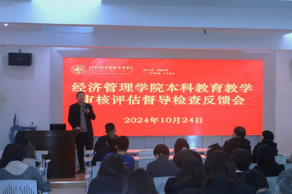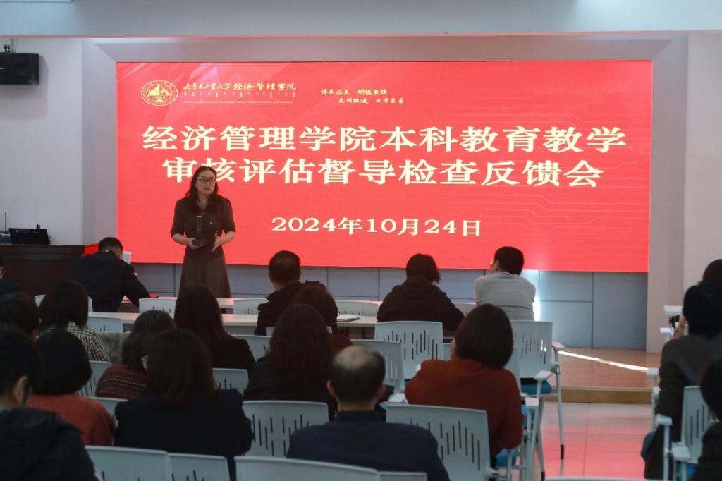 格迪副经理就审核评估督导检查结果向全院教师进行反馈,从教学资料入库情况、抽查文档存在的共性问题课堂教风学风问题做详细说明。随后晓燕经理结合本次审核评估督导意见反馈,要求老师们进行本科教学反思,通过审核评估补齐短板,突出亮点,打造经管特色