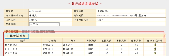 重复步骤三、四,所有班级安排完成(页面下方“需排列表”已清空)后,点击【返回】,申请考试列表显示所安排的考试。如需修改,点击【考试安排】。确认无误后,点击提交状态列中的【未提交】,提交状态变成已提交后,申请进入审批环节。教师提交调课申请后,一定要及时告知系主任进行审批。