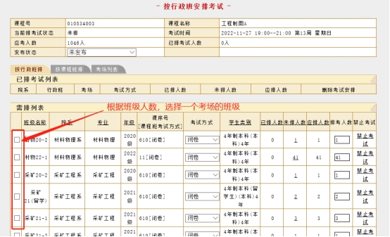根据考场容量来选择班级,一般一个考场的容量小于80人。重修员工的课序号是610——617。在安排班级时,将重修生安排在一起,正常班安排在一起。选择班级后,点击下方的【添加考场】按钮,进入步骤四(※重修生较多的公共课程,可选择【按课程班排】,将重修班安排后,安排正常班时会方便和高效)。
