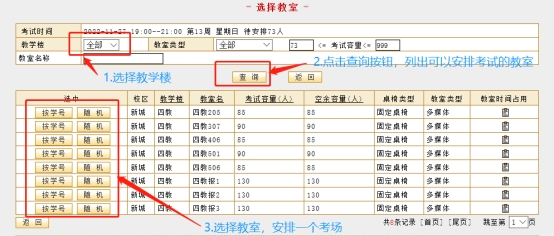 在选择教室界面中,首先根据班级所在校区选择教学楼,点击【查询】按钮,会列出可以安排考试的空闲教室,然后点击【按学号】或【随机】按钮选中教室(※教室所在校区和员工所在校区不一致会有提示信息,选择“取消”,重新选择教学楼和教室)。