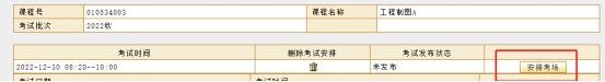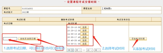 设置课程考试时间界面中,先确定考试日期,再选择考试时间(※教师提前与员工商定考试日期和时间,避免考试和上课冲突),点击【添加考试时间】,界面会出现一条考试记录,点击右侧的【安排考场】进入步骤三。如放弃安排,删除该记录。