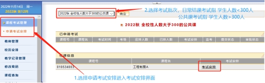 员工人数小于300人,选择“日常结课考试”,日常结课只能安排在星期一到星期五;员工人数大于300人,选择“公共课考试”,不限时间。按【确定】后显示所代课程列表,选择拟申请考试课程【考试安排】,进入步骤二。