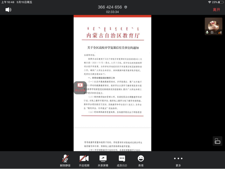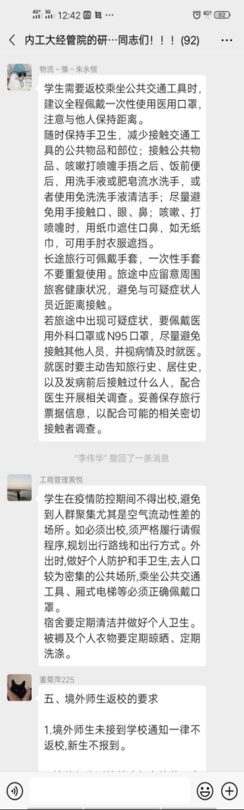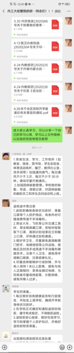 参会人员为365英国上市网站官网全体研究生,通过腾讯会议进行防控教育相关学习。学院组织研究生们对国家卫健委下发的《关于印发大专院校新冠肺炎疫情防控技术方案的通知》、内防指下发的《关于统筹做好2020年春季学习开学复课和新冠肺炎疫情防控工作有关事宜的通知》、内教疫防下发的《关于开展内蒙古自治区高等院校开学复课疫情防控工作检查评估工作的通知》和《关于印发<内蒙古自治区教育系统应对学校突发新冠肺炎疫情处置预案>的通知》文件进行了认真学习。会议过后,让每位同学认真学习防控疫情文件并将心得分享到班级群,会议准确传达了教育部要求,会议宗旨:做好开学后新冠肺炎疫情防控工作,快速反应、及时控制和妥善处置学校突发新冠肺炎疫情,将疫情传播和次生危害降低到最低程度,确保师生员工生命安全和身体健康,切实维护学校安全稳定工作。