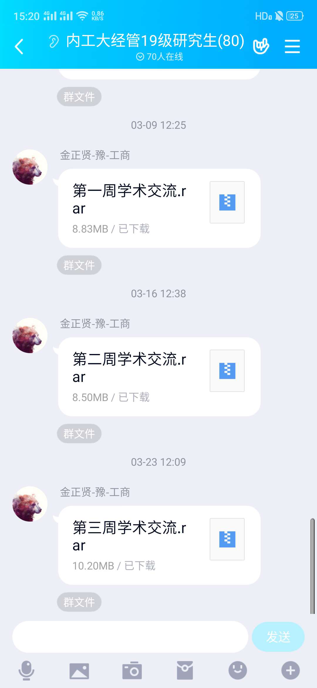 研究生一年级和二年级的员工按专业分为若干小组。通过微信等平台创建各小组的学术交流群,每周周一、周四上午9:00在各自学术小组群里分享讨论本专业优秀期刊论文(每周2篇)。同学们针对分享的文章进行积极探讨,相互学习,相互促进,增进交流机会,增强学习兴趣。研究生会学术部在每周周末将同学们一周的学习成果统一整理汇总,在QQ群众共享,以便进一步学习、巩固。此次学术交流活动将持续至开学,并将根据员工们在此期间的文章分享次数、文章分享质量、交流次数以及交流活跃度,每个小组评选出两名“学术交流之星”。
