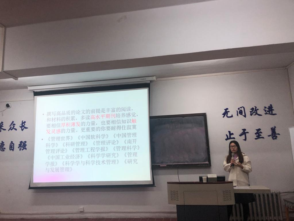 曲廷琛同学提出撰写高品质论文的前提是丰富的阅读和材料的积累,多读高水平期刊能够培养思维上和言语上的感觉,列举了适合我们经济和管理专业的A刊和B刊的种类,并细心梳理了案例论文的逻辑结构,指出撰写论文各个部分的要点内容。最后指出了申请考核博士研究生的注意事项,重点强调了趁早发表论文对于考博的重要性。