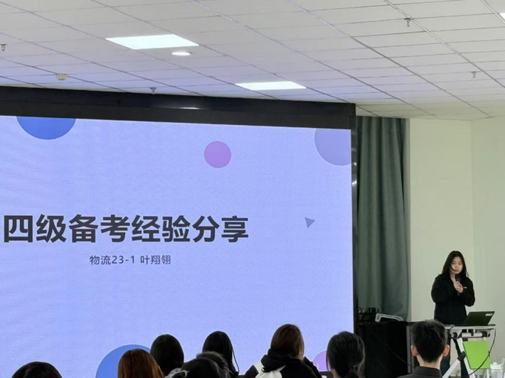 随后,多位优秀学长学姐依次分享备考策略。首先,来自公共22-2的刘佳睿同学分享了词汇积累的方法,她指出“词汇是英语学习的基石,一定要坚持每天背诵单词”。其次,物流23-1的叶翔翎同学则分享了听力备考技巧。她表示,平时可以多听一些英文广播,培养英语语感。接着,资环22-2的马润雨同学分享了写作备考经验。她建议同学们平时多积累一些优秀的写作模板和常用句式并且要注重写作思路的训练。随后,24级研究生张有贤同学针对翻译部分给出了实用的建议。她认为,要提升翻译能力,要积累一定量的专业词汇和固定表达。23级物流专业的研究生齐龙祥同学分享了阅读备考技巧。最后,24级研究生梁旭阳同学分享了自己的综合备考经验。她建议同学们制定详细的备考计划,定期进行模拟考试,提前适应考试节奏。