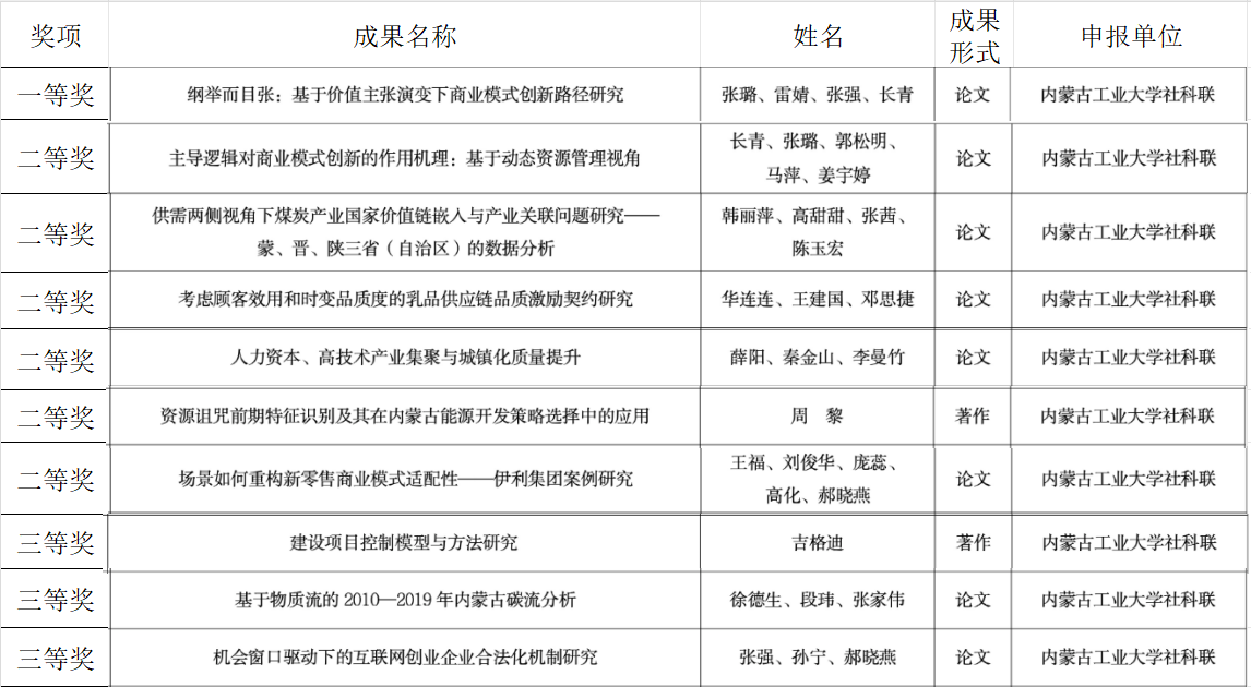 近日,内蒙古自治区社会科学界联合会发布《关于第十一届内蒙古自治区哲学社会科学奖评选结果的公示》,全区评选产生拟奖励成果一等奖12项、二等奖120项、三等奖206项。公司教师在本次评选中表现突出,张璐老师荣获一等奖;长青、韩丽萍、华连连、薛阳、周黎、王福等六位老师荣获二等奖;吉格迪、徐徳生、张强等三位老师荣获三等奖,实现了公司在自治区哲学社会科学领域奖项的新突破,是公司持续推进有组织科研、服务地方发展的又一重要成果。