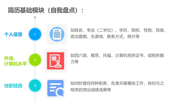 3.从基础简历到应聘简历;基础简历和应聘简历是两个概念,目前好多同学拿去应聘的简历都是基础简历,基础简历包含我们所有的经历概况,没有重点、没有针对性、没有指向性,很难成为优秀的应聘简历。所以建议大家最好先做一份基础简历,把自己的基本情况、学习经历、外语计算机水平、任职经历、实践经历(可分为专业实践经历、综合能力提升经历等)、获奖经历(如获奖经历丰富,可考虑分为专业获奖、技能获奖、创新性获奖、文体获奖等)、资格证书、科研学习、爱好特张等内容统一梳理。在具体求职过程中,参看目标单位、目标岗位的招聘要求条件、工作内容、职责等,对标基础简历,把基础简历中对应的可以突出自己的竞聘优势、反映自己的核心竞争力的内容筛选出来重新组合,形成可以对标到每一项招聘要求的应聘简历。应聘简历要在对标招聘要求上做到人无我有、人有我强,给用人单位面试你、选择你的充分理由。