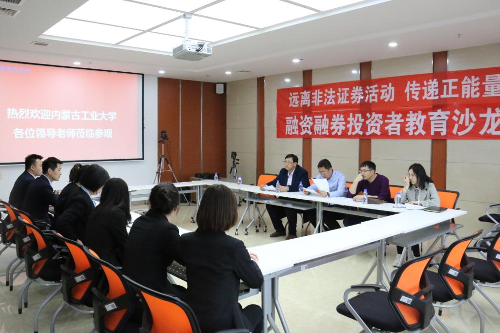 3月22日下午,调研组对公司员工实习的恒泰证券内蒙古分公司及国泰君安呼和浩特分公司进行了走访、调研。详细了解了金融15员工顶岗实习的具体情况。并与国泰君安呼和浩特分公司领导进行了座谈,双方就员工实习,校企合作等相关情况深入交换了意见。随后,员工代表王欣向大家汇报了两周的学习情况,表示两周的实习让他们对证券行业有了深刻的了解,也让他们明确了自己的就业方向。