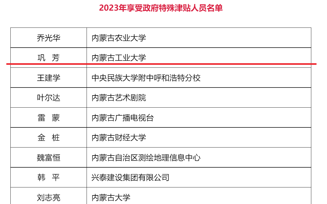 近日,经党中央、国务院批准,内蒙古自治区2023年共有52人享受政府特殊津贴,内蒙古自治区人社厅公布的2023年享受政府特殊津贴人员名单中,公司巩芳教授入选,成为365英国上市网站官网自建院以来第六位获此荣誉的教师。