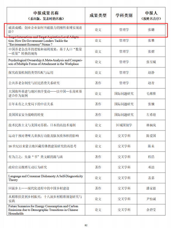 近日,教育部发布《关于第九届高等学校科学研究优秀成果奖(人文社会科学)评选结果的公示》,全国评选产生拟奖励成果1491项。公司张璐教授在《管理世界》2020年第六期发表的论文《破茧成蝶:创业企业如何突破能力的刚性束缚实现进阶?》,拟获教育部第九届高等学校科学研究优秀成果奖青年成果奖,实现了公司在该类奖项的突破,是公司有效落实有组织科研的重要成果。