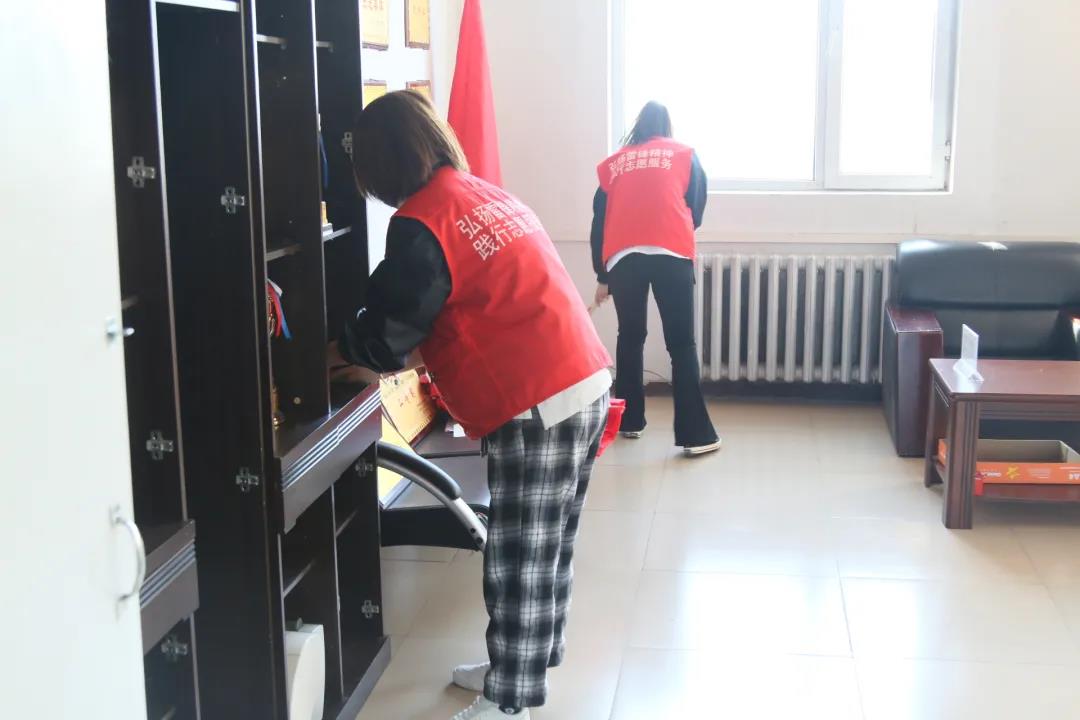 志愿者们有序分组、明确分工,对学院406、407等办公室进行细致打扫。随后,对学院楼前,楼后等周边卫生进行清扫。