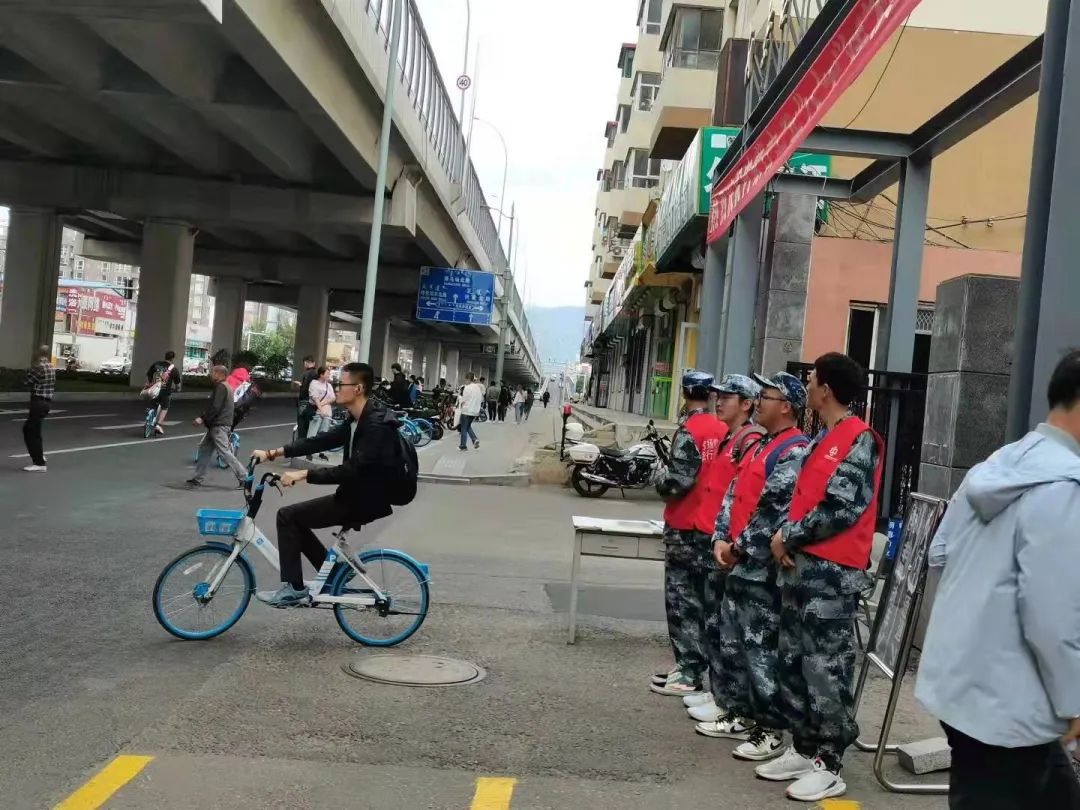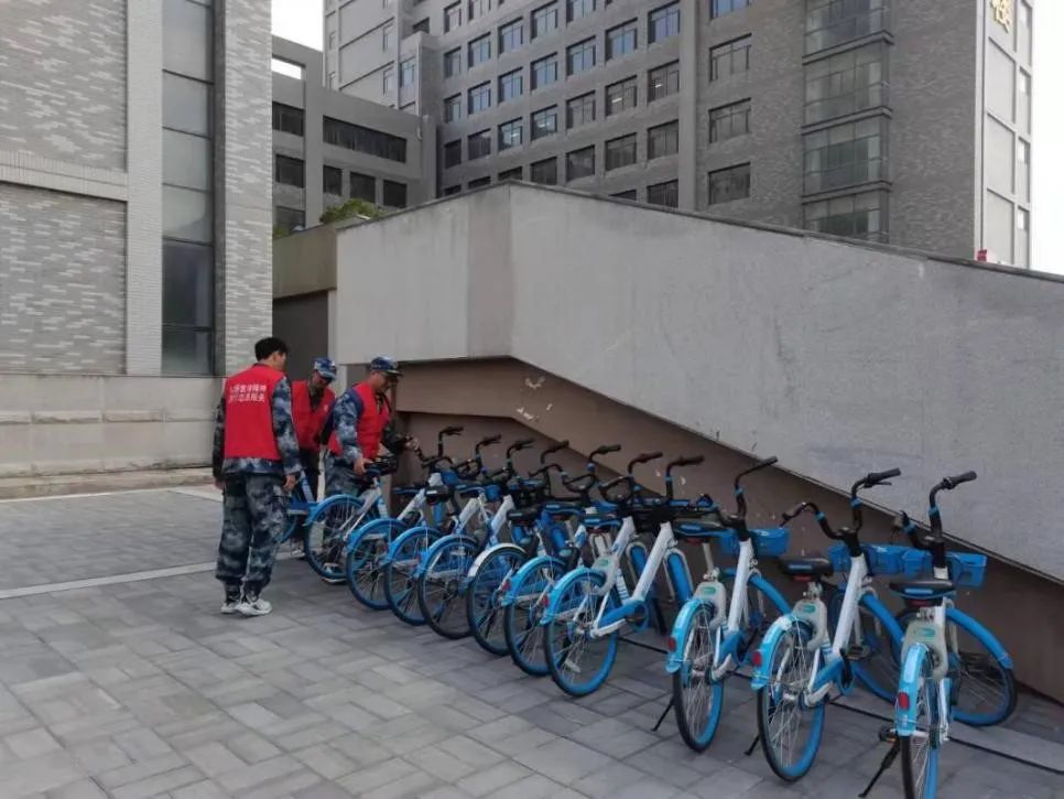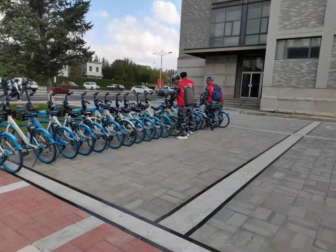为营造整洁、美丽的校园环境。志愿者们在校园内部协助工作人员,对校园内随处摆放的共享单车进行有序排列。