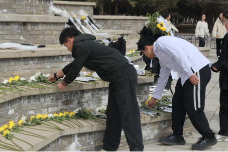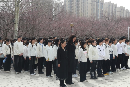 活动现场庄严肃穆,师生身着素装,整齐列队于烈士纪念碑前。全体人员依次敬献鲜花,鞠躬默哀,以朴素仪式表达对英烈的深切追思。党员代表韩姬雪诵读祭文,回顾先烈浴血抗战的英勇事迹,号召师生铭记历史、珍视和平、传承精神。“先烈用生命换来今日盛世,我们更应肩负时代责任。”随后,全体党员面向党旗重温入党誓词,铿锵誓言彰显了新时代青年的忠诚与担当。