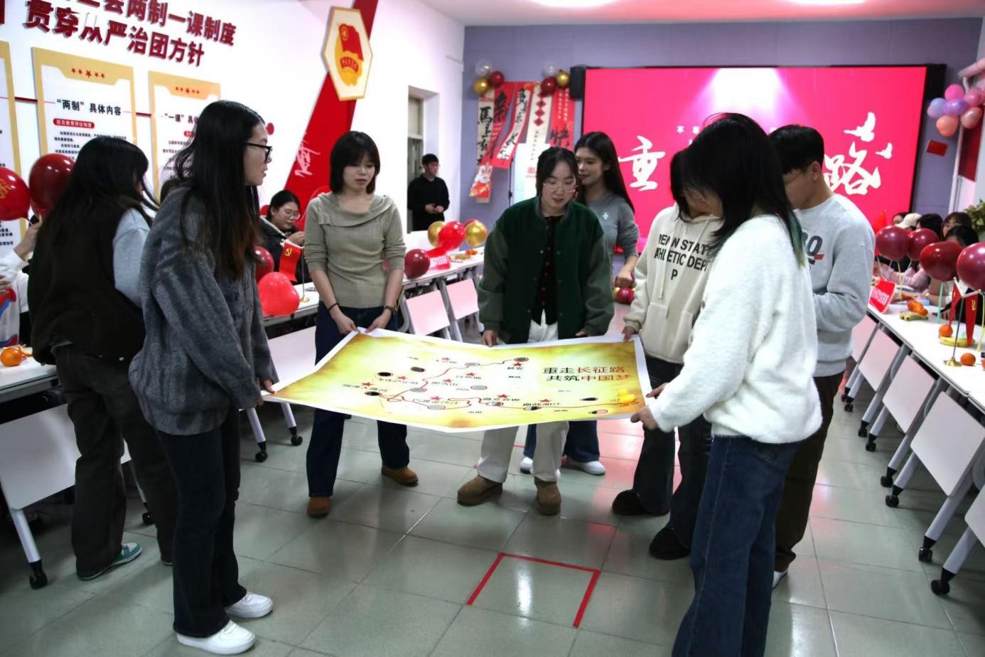 “四渡赤水”竞技赛环节,各小组迅速切换状态,以协作拼搏的劲头沉浸式感受革命先辈的战略智慧与顽强意志。队员们沉着应变、协同作战,仿佛回到了那个战火纷飞的革命年代。“重走长征路”画布挑战中,同学们同心同德、步调一致,一笔一划绘就长征路线,一步步协作体悟奋斗艰辛,用实际行动诠释了“团结就是力量”的深刻内涵。