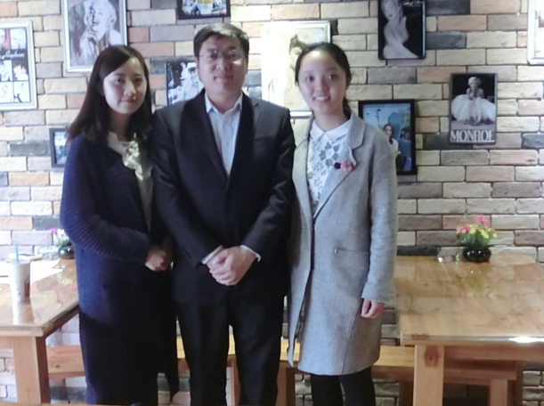 英国365网站管理学院的会计14班晁月、财管14班蔺雅荣与员工赵辉(中)的合影